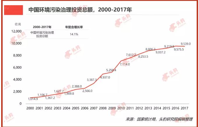進入21世紀之后,中國環保行業進入快速發展階段,環保投入出現跨越式增長。中國經濟高速發展的同時,中國生態環境日益嚴峻,政府逐漸將工作重心放到生態文明建設上。黨的十八大以來,中國出臺并落實了《關于加快推進生態文明建設的意見》、《生態文明體制改革總體方案》、《大氣污染防治行動計劃》、《水污染防治行動計劃》、《土壤污染防治行動計劃》等40多項涉及生態文明建設方案,中國環保事業進入新的高度。在政府的大力支持下,中國環境污染治理投資總額從2000年的1,014.9億元增長到2017年的9,539.0億元,年復合增長率達到14.1%。