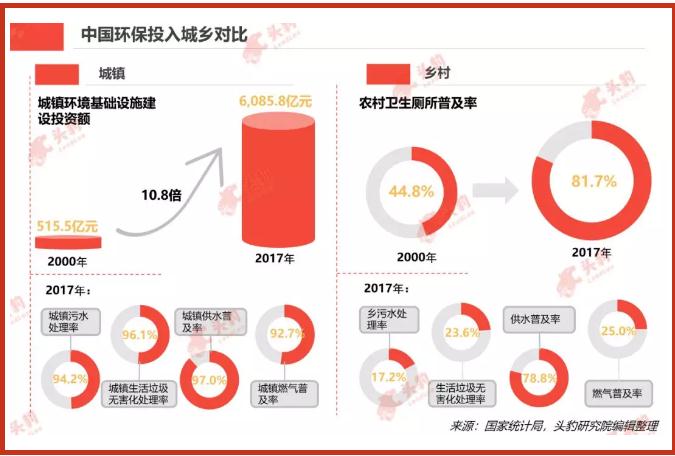 城鎮方面,中國城鎮環境基礎設施建設投資額從2000年的515.5億元增長到2017年的6,085.8億元,增長了10.8倍。2017年,中國城鎮(城市+縣城)污水處理率94.2%,城鎮生活垃圾無害化處理率96.1%,城鎮供水普及率97.0%,城鎮燃氣普及率92.7%。鄉村方面,中國農村衛生廁所普及率從2000年的44.8%增長到81.7%,2017年,中國鄉污水處理率17.2%,生活垃圾無害化處理率23.6%,供水普及率78.8%,燃氣普及率25.0%。中國鄉村市政公用設備仍有較大提升空間。