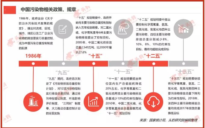 污染物減排是改善環境質量最直接的手段,政府持續發布政策控制污染物排放量,取得了顯著成果。1986年,政府出臺《關于防治水污染技術政策的規定》,成為中國污染總量控制制度的開端。“九五”期間,政府首次制定了《污染物排放總量控制計劃》。“十五”規劃綱要中,政府首次將主要污染物總量控制指標納入中國經濟社會發展規劃綱要。之后的“十一五”規劃綱要、“十二五”規劃綱要、“十三五”規劃綱要中,政府繼續提出主要污染物總量控制指標,并均超額完成目標,中國在污染物總量控制方面成效明顯。