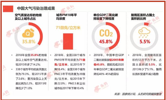 (2)大氣污染治理是近年來中國環保事業的重點,自2013年國務院印發“大氣十條”,提出了10條35項大氣綜合治理措施以來,中國大氣污染治理逐漸進入快速車道,治理效果逐年提升。2018年,全國35.8%的地級及以上城市空氣質量達標,338個城市PM10年平均濃度為71微克/立方米,中國單位GDP二氧化碳排放較2005年降低45.8%,全國酸雨區面積占國土面積的5.5%,較2013年少了5.1%。