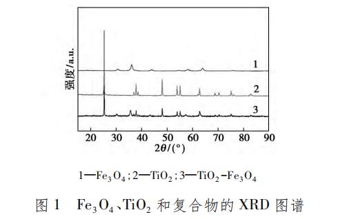 Fe3O4、TiO2 和復合物的 X 射線衍射圖譜如圖 1所示。