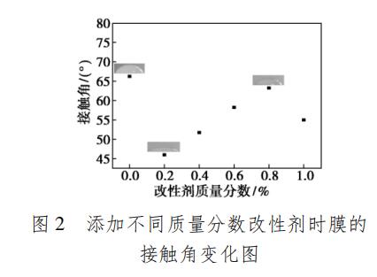 由圖 2 可以看出,當不添加共混改性劑時,接觸角最大,說明單純的 PES 膜是疏水性比較強的膜,因為 PES 含有0.jpg基團,所以表現出疏水性。
