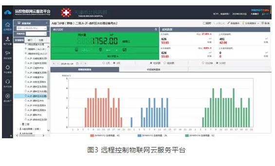 天津市北辰醫(yī)院于2018年11月引進(jìn)了遠(yuǎn)大科技集團(tuán)的醫(yī)院能耗監(jiān)測平臺項目[4],該項目以智能計量系統(tǒng)為代表,主要涵蓋了醫(yī)院各科室安裝智能遠(yuǎn)傳電表、智能遠(yuǎn)傳水表、后勤一站式報修系統(tǒng)。醫(yī)院在項目基礎(chǔ)上建立了后勤運(yùn)營智能管控平臺,將反滲水處理系統(tǒng)的信息納入到平臺管理中,實時監(jiān)測處理系統(tǒng)的工作狀態(tài),管理界面如圖3所示。廢水回收系統(tǒng)進(jìn)水和排水?dāng)?shù)量的監(jiān)測,是分析研判回收系統(tǒng)運(yùn)維狀態(tài)的重要依據(jù)。同時,智能平臺的應(yīng)用層控制,實現(xiàn)了回收廢水和節(jié)約用水的直觀量化,提高了設(shè)備安全運(yùn)行的可靠性。