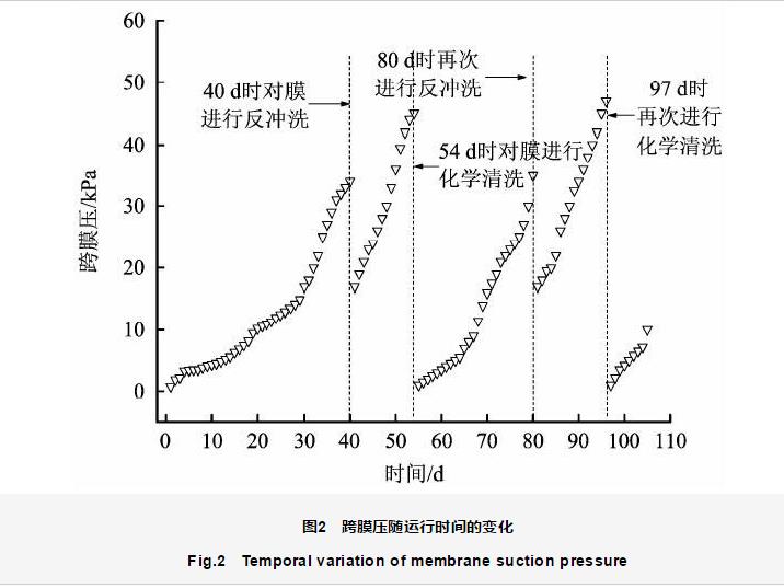 在膜吸壓力初次達到35 kPa時,進行1次反沖洗;待膜吸壓力再次升至50 kPa,接近蠕動泵的閾值時對膜進行化學清洗,即結束反應器運行,取出膜組件沖洗去掉濾餅層,再采用1%的NaClO溶液將其浸泡過夜,第2天再以清水沖洗。
