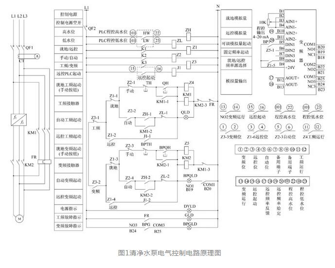 除上述功能外,還具有其他多項功能:工頻就地(水泵就地控制柜)起動、變頻就地起動、就地手動調(diào)頻、工頻就地停止、變頻就地停止、動力電源就地指示、工頻起動就地指示、變頻起動就地指示、工頻故障就地指示、變頻故障就地指示、去離子水設備電動機電流就地顯示、電動機遠方(集控室PLC程控畫面)起動、電動機遠方停止、電動機起動遠方顯示、電動機停止遠方顯示、頻率遠方給定、頻率反饋遠方顯示、就地和遠方控制方式顯示等。改進后的清凈水泵電氣控制原理如圖1所示。